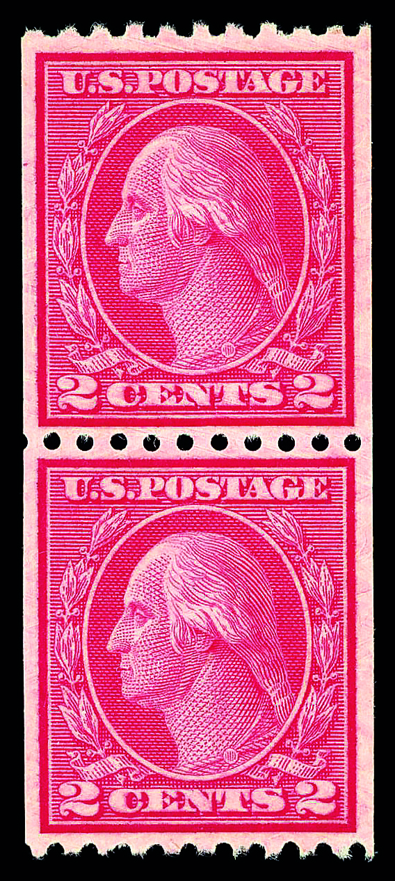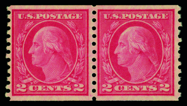 5212 nh 492 image1916, 2¢ carmine, type III, unwatermarked, rotary press coil, perf. 10 vertically (Scott 492), pair, o.g., never hinged, Fine to Very Fine.