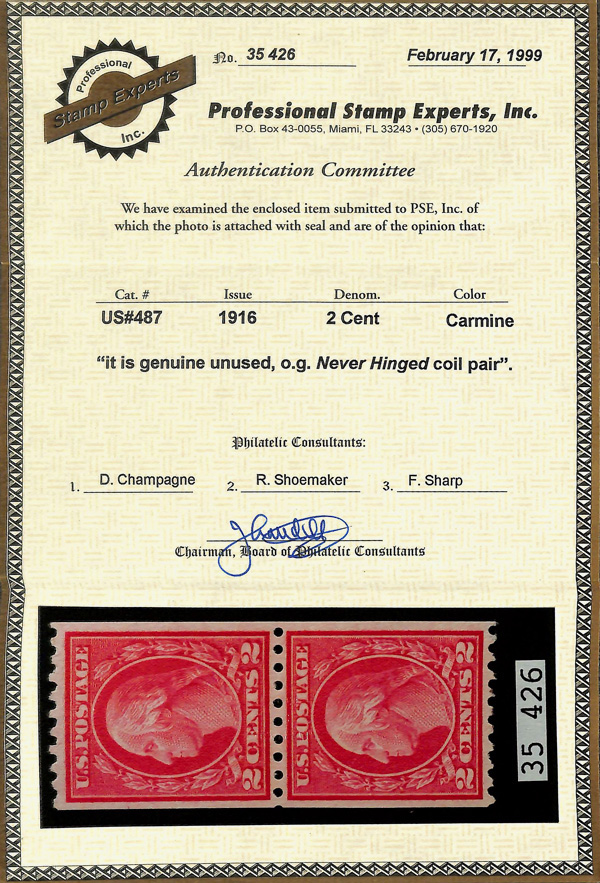 5211 nh 487 image1916, 2¢ carmine, type II, unwatermarked, rotary press coil, perf. 10 horizontally (Scott 487), pair, o.g., never hinged, Very Fine to Extremely Fine, with 1999 P.S.E. certificate.