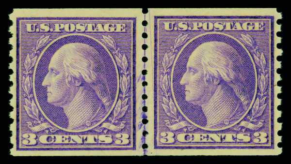 5213 nh 494 image1918, 3¢ violet, type II, unwatermarked, rotary press coil, perf. 10 vertically (Scott 494), joint line pair, o.g., never hinged, Fine to Very Fine.