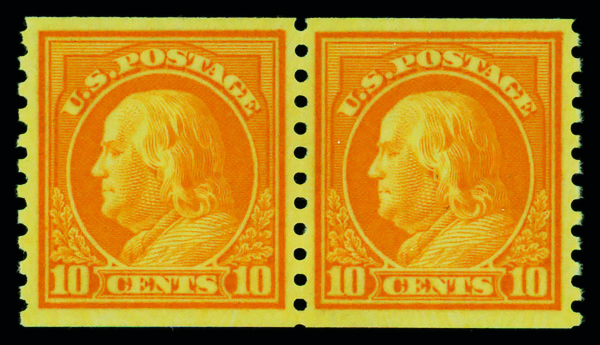 5214 nh 497 image1922, 10¢ orange yellow, unwatermarked, rotary press coil, perf. 10 vertically (Scott 497), pair, o.g., never hinged, Very Fine to Extremely Fine.