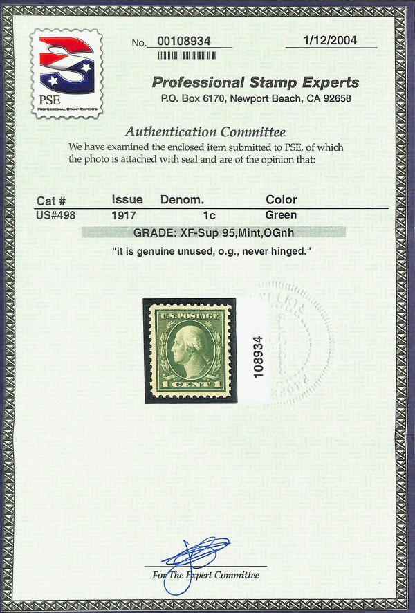 5215 nh 498 image1917, 1¢ green, perf. 11 (Scott 498), o.g., never hinged, Extremely Fine to Superb, with 2004 P.S.E. certificate graded XF-SUP 95.
