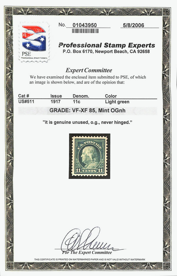 5220 nh 511 image1917, 11¢ light green, perf. 11 (Scott 511), o.g., never hinged, Very Fine to Extremely Fine, with 2006 P.S.E. certificate graded VF-XF 85.