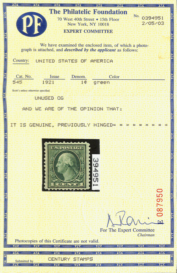 5237 og 545 image1921, 1¢ green, rotary press coil waste, perf. 11 (Scott 545), o.g., very lightly hinged, Fine to Very Fine, with 2003 P.F. certificate.
