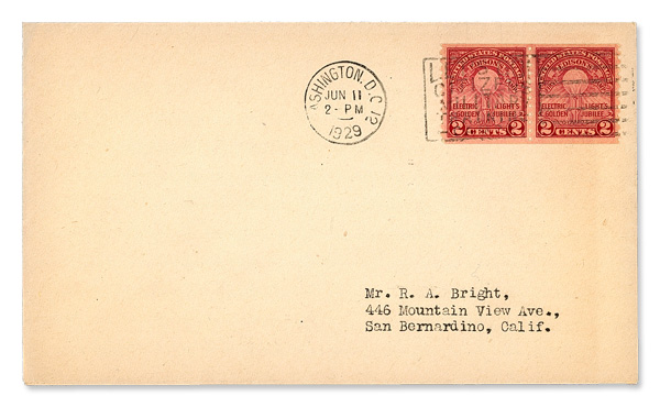 5280 cover 656 image1929, 2¢ Edison, rotary press coil (Scott 656), pair on First Day Cover 'WASHINGTON, D.C./JUN 11/1929', Very Fine.