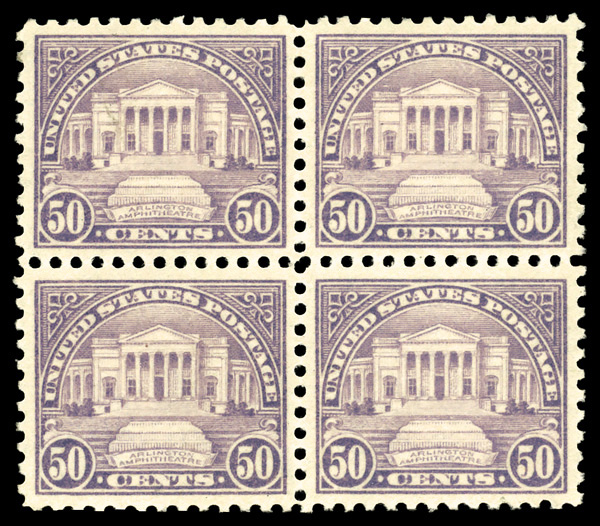 5255 nh/ogbl 570 image1922, 50¢ Arlington Amphitheater (Scott 570), block of 4, o.g., bottom stamps never hinged / top stamps very lightly hinged; a few tiny gum skips, Very Fine to Extremely Fine.