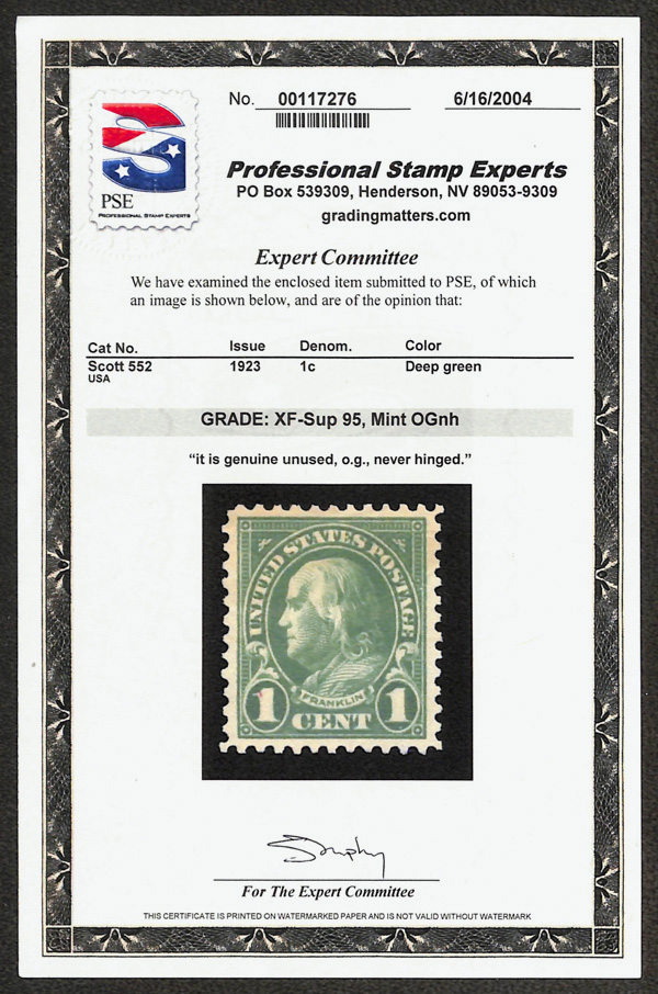 5242 nh 552 image1923, 1¢ Franklin (Scott 552), perfect visual impact, o.g., never hinged, Extremely Fine to Superb, with 2004 P.S.E. certificate graded XF-SUP 95.