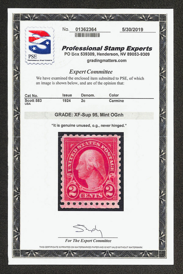 5259 nh 583 image1924, 2¢ Washington, rotary press printing, perf. 10 (Scott 583), bright, flawless freshness, o.g., never hinged, Extremely Fine to Superb, with 2019 P.S.E. certificate graded XF-SUP 95.