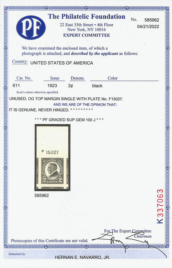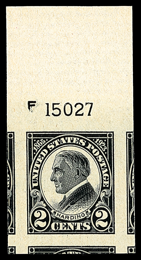 5267 nh 611 image1923, 2¢ Harding, imperf. (Scott 611), top margin single with plate number, oversized appeal and style, o.g., never hinged, with 2022 P.F. certificate graded GEM 100J.