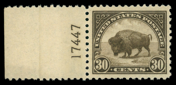 5254 nh 569 image1923, 30¢ American Buffalo (Scott 569), plate number single, o.g., never hinged, jumbo margins, Very Fine to Extremely Fine. (Image) Suggested Bid $76