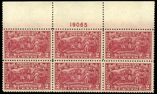 5277 nhbl 644 image1927, 2¢ Burgoyne (Scott 644), top margin plate block of 6, Excellent intensity and contrast, o.g., never hinged, Very Fine.