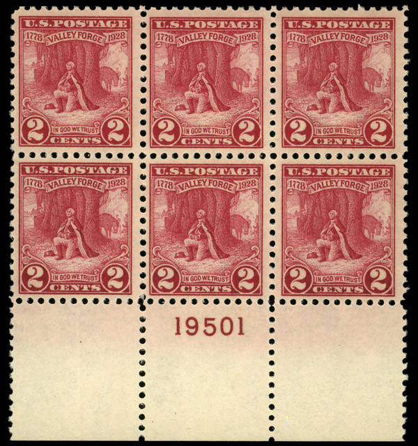 5278 nhbl 645 image1928, 2¢ Valley Forge (Scott 645), plate block of 6, o.g., never hinged, Fine to Very Fine.