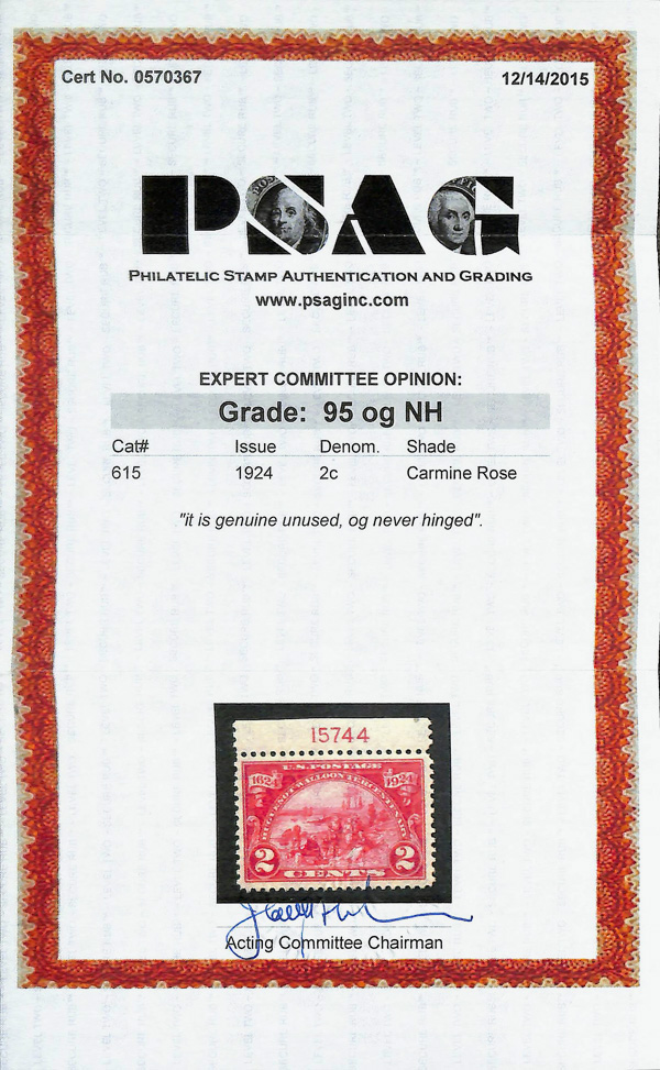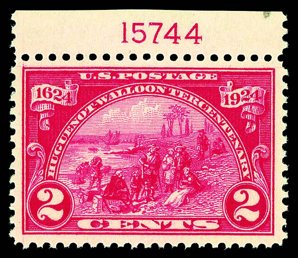 5268 nh 615 image1924, 2¢ Huguenot-Walloon (Scott 615), plate number single, o.g., never hinged, Extremely Fine to Superb, with 2015 P.S.A.G. certificate graded XF-SUP 95.