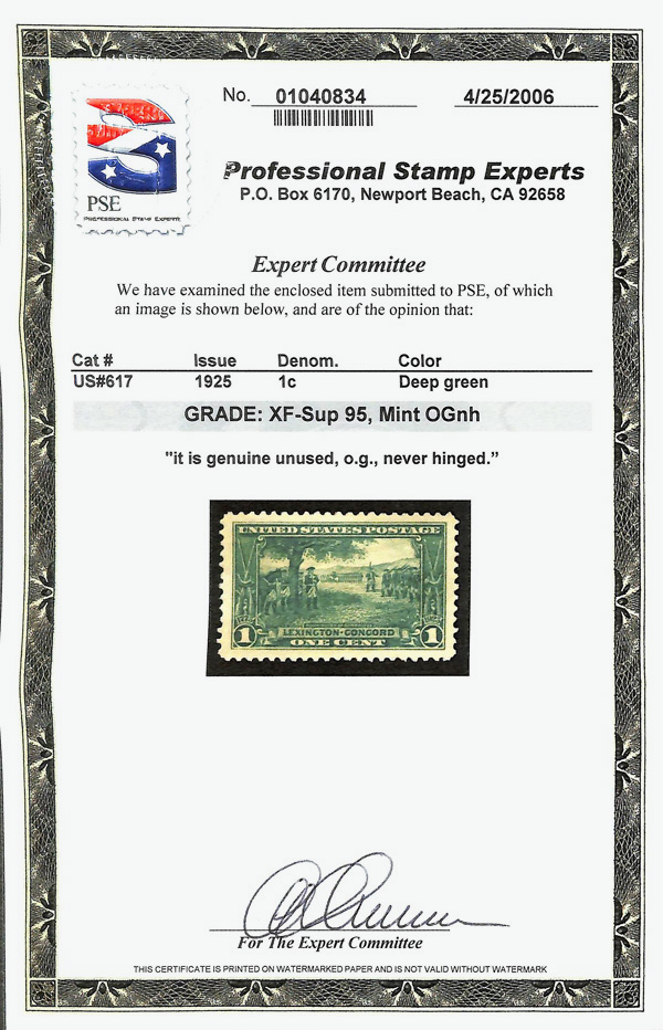 5270 nh 617 image1925, 1¢ Lexington-Concord (Scott 617), o.g., never hinged, Extremely Fine to Superb, with 2006 P.S.E. certificate graded XF-SUP 95.
