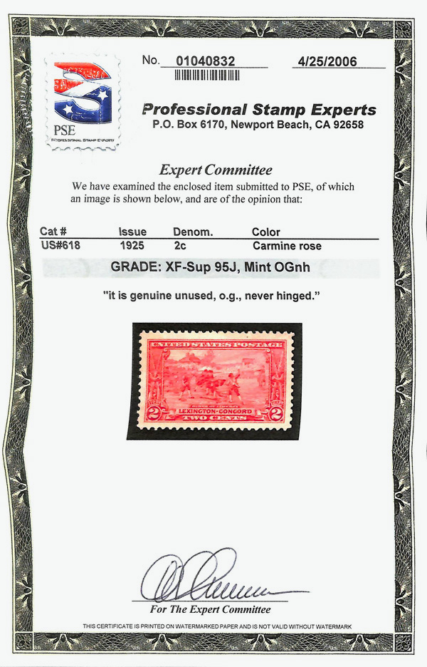 5271 nh 618 image1925, 2¢ Lexington-Concord (Scott 618), o.g., never hinged, jumbo margins, Extremely Fine to Superb, with 2006 P.S.E. certificate graded XF-SUP 95J.