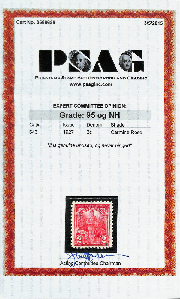 5276 nh 643 image1927, 2¢ Vermont (Scott 643), o.g., never hinged, Extremely Fine to Superb, with 2015 P.S.A.G. certificate graded XF-SUP 95.