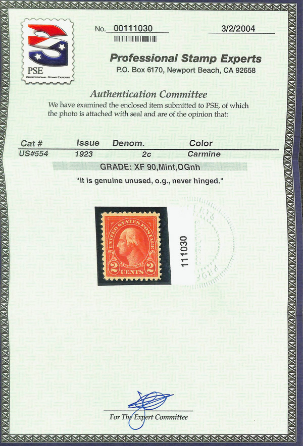 5244 nh 554 image1923, 2¢ Washington (Scott 554), o.g., never hinged, Extremely Fine, with 2004 P.S.E. certificate graded XF 90.
