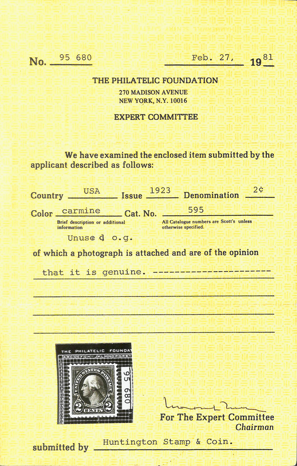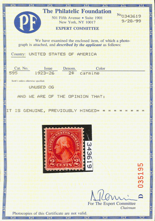 5264 og 595 image1923, 2¢ Washington, rotary press coil waste, perf. 11 (Scott 595), o.g., lightly hinged, Very Fine, with 1999 P.F. certificate & 1981 P.F. certificate.