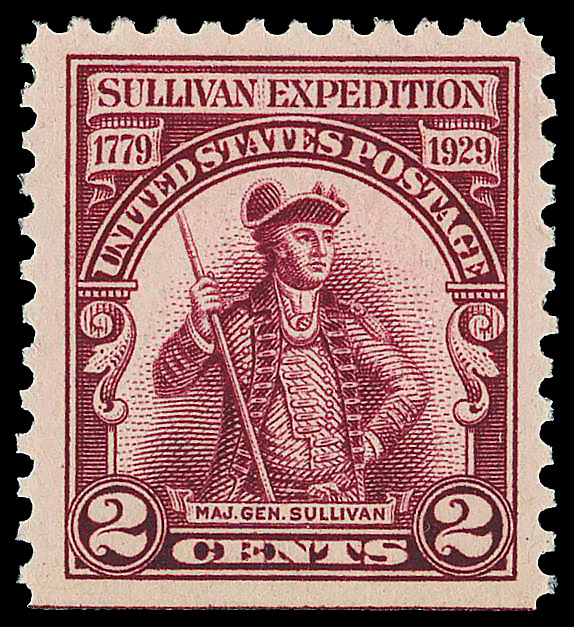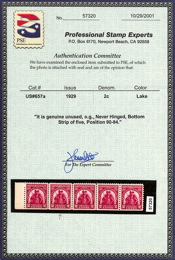 5281 nh 657a image1929, 2¢ Sullivan Expedition, lake color error (Scott 657a), bottom margin single, o.g., never hinged, Extremely Fine, with 2001 P.S.E. certificate for strip.
