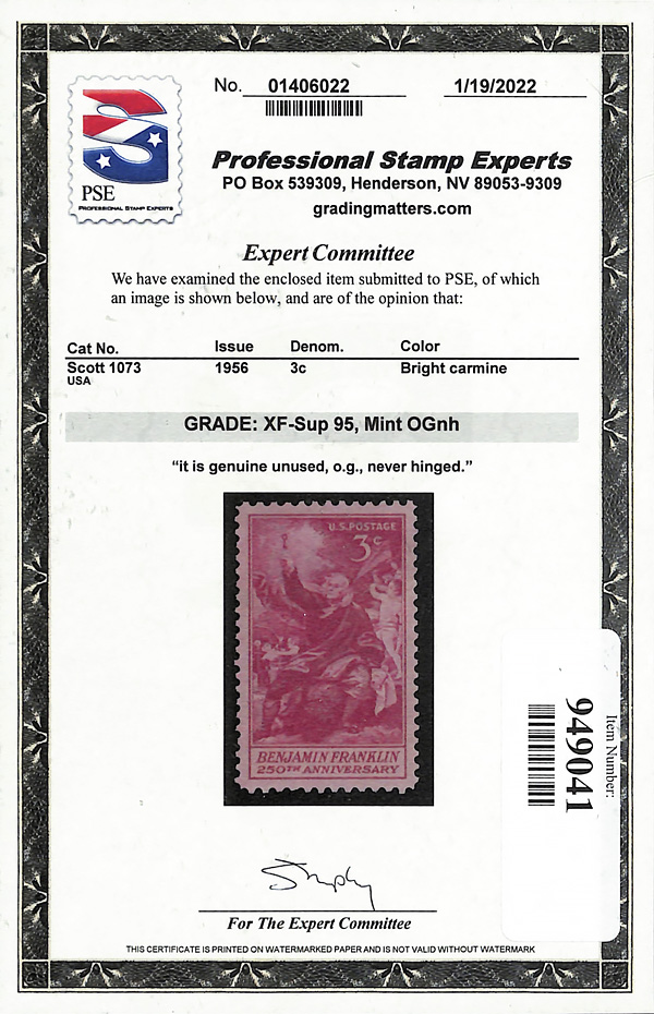 5317 nh 1073 image1956, 3¢ Benjamin Franklin (Scott 1073), o.g., never hinged, Extremely Fine to Superb, with 2022 P.S.E. certificate graded XF-SUP 95.