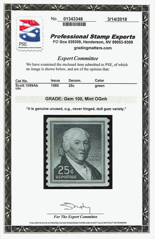 5313 nh 1059Ab image1973, Liberty Issue, 25¢ Paul Revere, horizontal coil, tagged, dull gum (Scott 1059Ab var.), impressive example, o.g., never hinged, with 2018 P.S.E. certificate graded GEM 100.