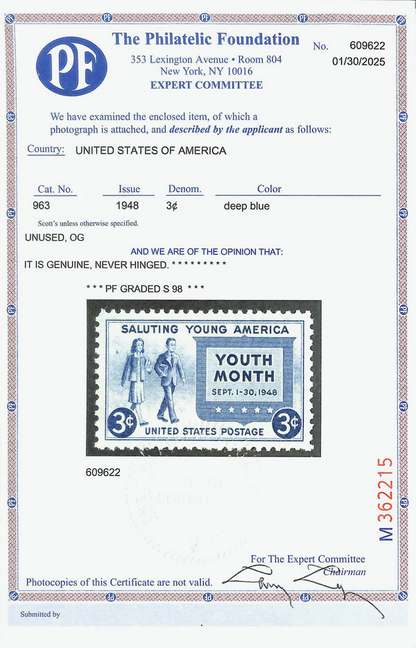 5305 nh 963 image1948, 3¢ Salute to Youth (Scott 963), o.g., never hinged, Superb, with 2025 P.F. certificate graded SUP 98.