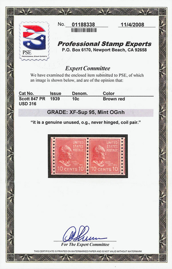 5296 nh 847 image1939, Presidential Issue, 10¢ Tyler, horizontal coil, perf. 10 vertically (Scott 847), pair, o.g., never hinged, Extremely Fine to Superb, with 2008 P.S.E. certificate graded XF-SUP 95 for pair.