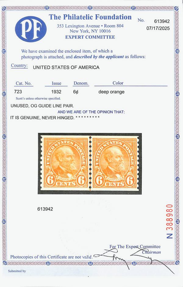 5288 nh 723 image1932, 6¢ Garfield, rotary press printing, horizontal coil (Scott 723), joint line pair, o.g., never hinged, Very Fine, with 2025 P.F. certificate.