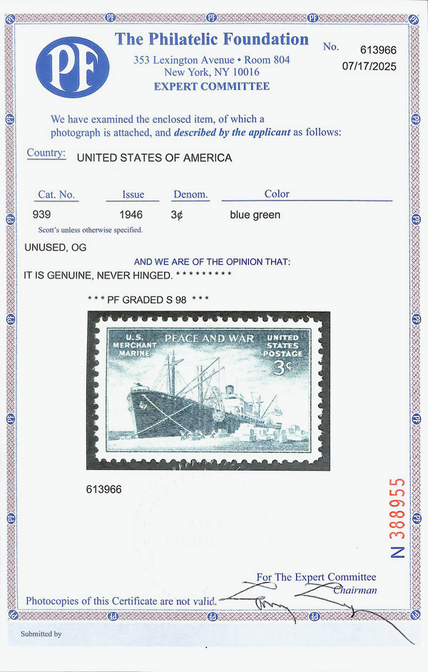 5301 nh 939 image1946, 3¢ Merchant Marine (Scott 939), o.g., never hinged, Superb, with 2025 P.F. certificate graded SUP 98.