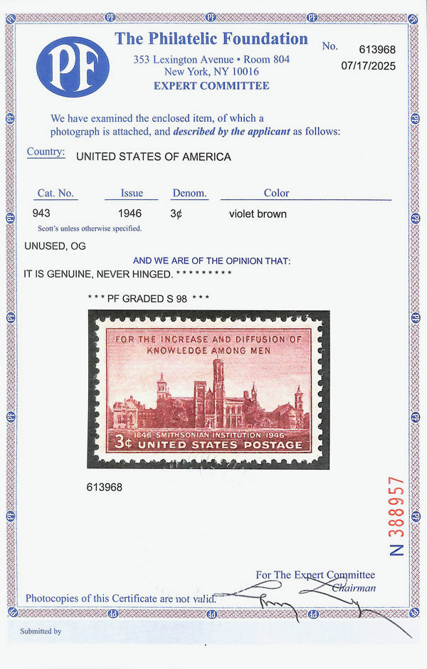5302 nh 943 image1946, 3¢ Smithsonian Institution (Scott 943), o.g., never hinged, Superb, with 2025 P.F. certificate graded SUP 98.