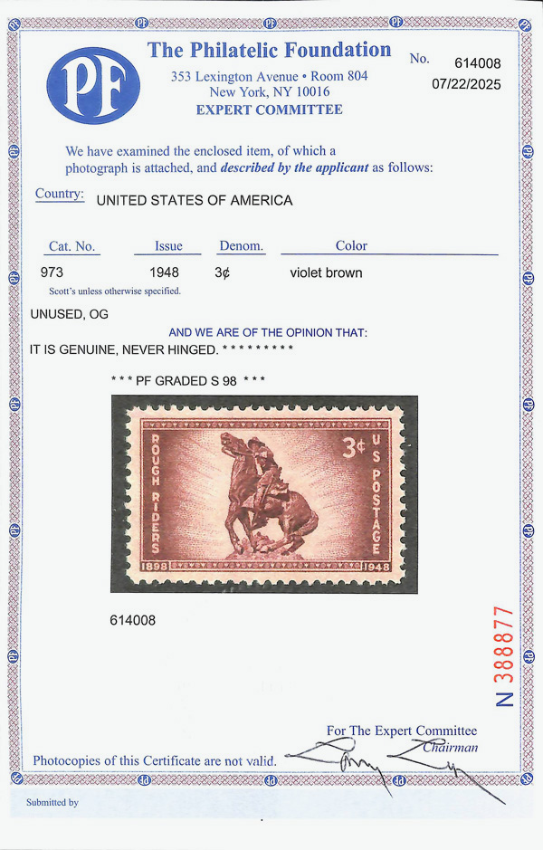 5307 nh 973 image1948, 3¢ Rough Riders (Scott 973), o.g., never hinged, Superb, with 2025 P.F. certificate graded SUP 98.