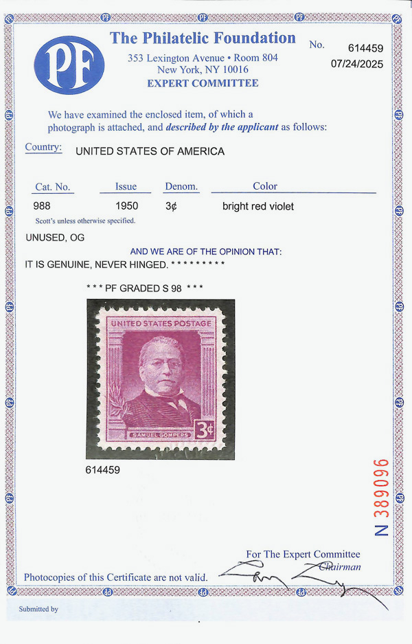 5308 nh 988 image1950, 3¢ Samuel Gompers (Scott 988), o.g., never hinged, Superb, with 2025 P.F. certificate graded SUP 98.