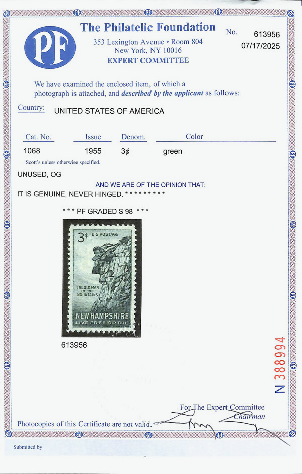 5315 nh 1068 image1955, 3¢ New Hampshire (Scott 1068), o.g., never hinged, Superb, with 2025 P.F. certificate graded SUP 98.