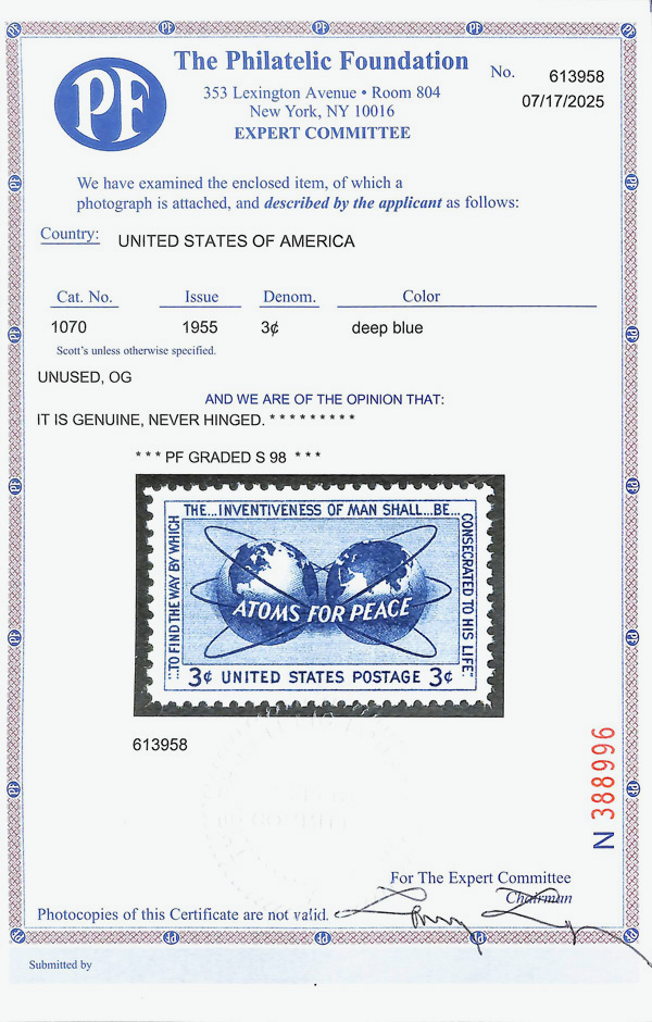 5316 nh 1070 image1955, 3¢ Atoms for Peace (Scott 1070), o.g., never hinged, Superb, with 2025 P.F. certificate graded SUP 98.