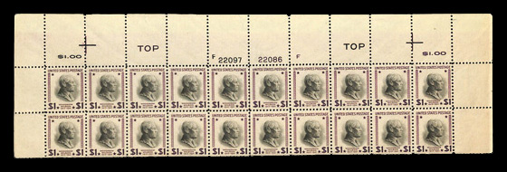 5294 nhbl 832 image1938, Presidential Issue, $1 Wilson (Scott 832), plate block of 20, o.g., never hinged, Very Fine.