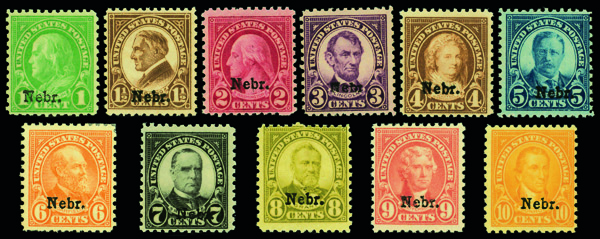 5284 nh 669-679 image1929, Nebr., 1¢ to 10¢ complete (Scott 669-679), set of 11, o.g., never hinged (6¢ small hinge remnant), Very Good to Fine.