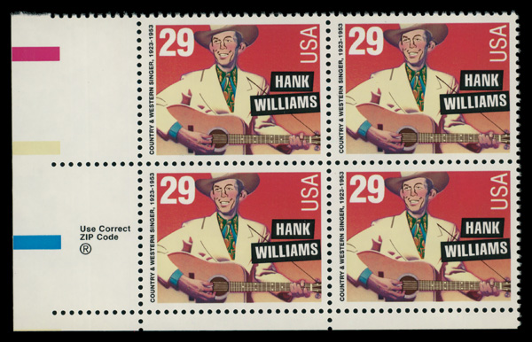 5349 nhbl 2723A image1993, 29¢ Hank Williams, perf 11.2 x 11.5 (Scott 2723A), zip block of 4, o.g., never hinged, Extremely Fine.