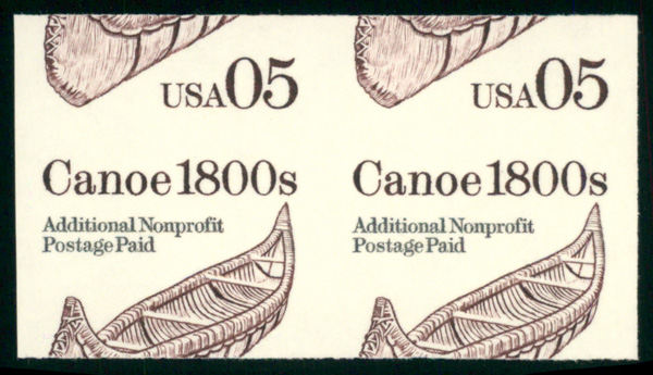 5340 nh 2453a image1991, Transportation Issue, 5¢ Canoe, brown, imperf. pair (Scott 2453a), major horizontal miscut, o.g., never hinged, Very Fine.