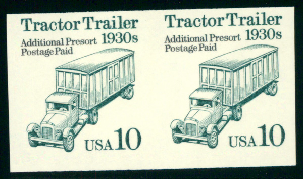 5341 nh 2457a image1991, Transportation Issue, 10¢ Tractor Trailer (engraved), imperf. pair (Scott 2457a), o.g., never hinged, Fine to Very Fine.
