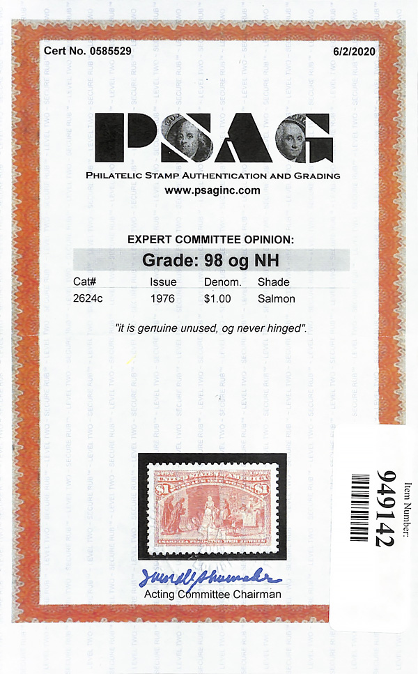 5346 nh 2624c image1992, $1 Voyages of Columbus, single from souvenir sheet (Scott 2624c), o.g., never hinged, Superb, with 2020 P.S.A.G. certificate graded SUP 98.