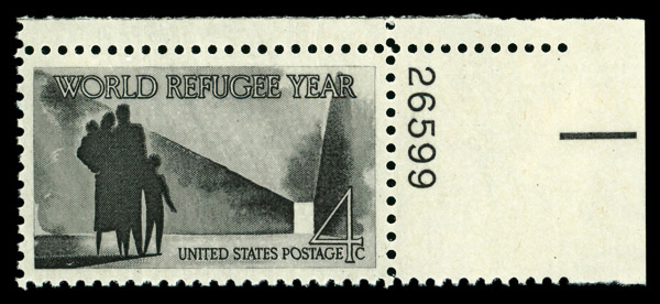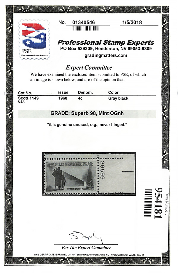 5325 nh 1149 image1960, 4¢ World Refugee Year (Scott 1149), plate number single, o.g., never hinged, Superb, with 2018 P.S.E. certificate graded SUP 98.