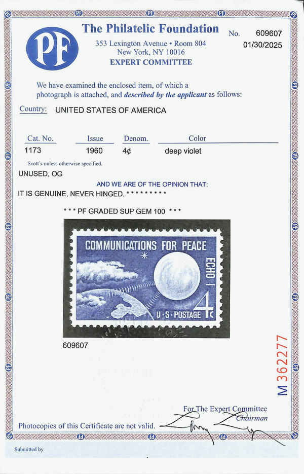 5327 nh 1173 image1960, 4¢ Echo I (Scott 1173), o.g., never hinged, Superb, with 2025 P.F. certificate graded GEM 100.