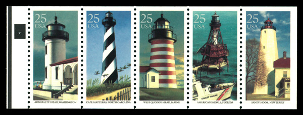 5343 BKnh 2474a image1990, 25¢ Lighthouses, booklet pane of 5 (Scott 2474a), plate #4, o.g., never hinged, Extremely Fine.