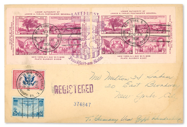 blue on a hinged-together vertical pair of 3¢ rose (65); much clearer than the Skinner-Eno illustration. (Image)