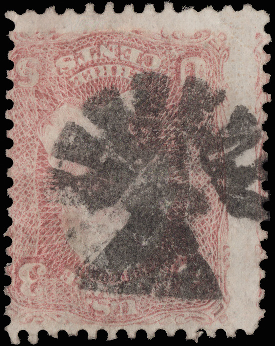 on a Very Fine 3¢ rose (65); listed as a solid top by Skinner-Eno. A handsome, somewhat worn example of this rare Waterbury Shield. Rohloff Q-10. (Image)