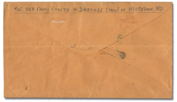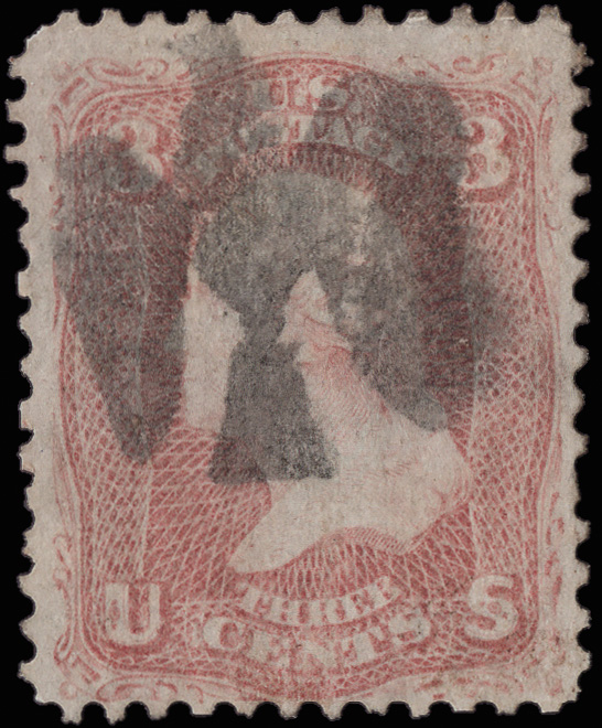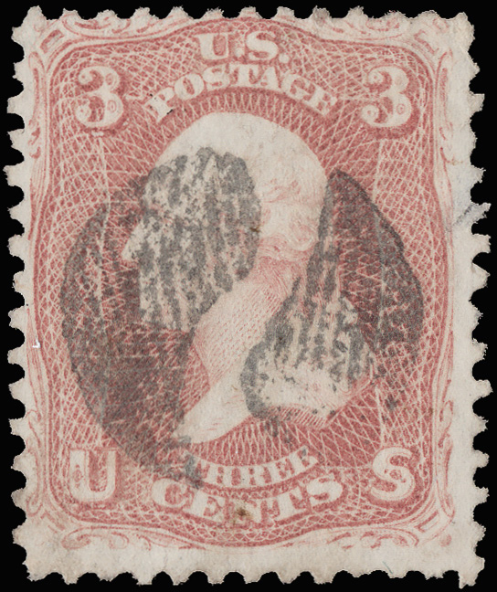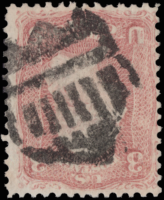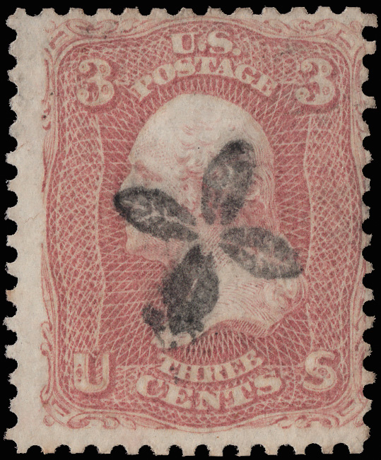a Fine 3¢ rose (65); larger circle than the Skinner-Eno device; "Union Mills, Pa." penciled on reverse. (Image)