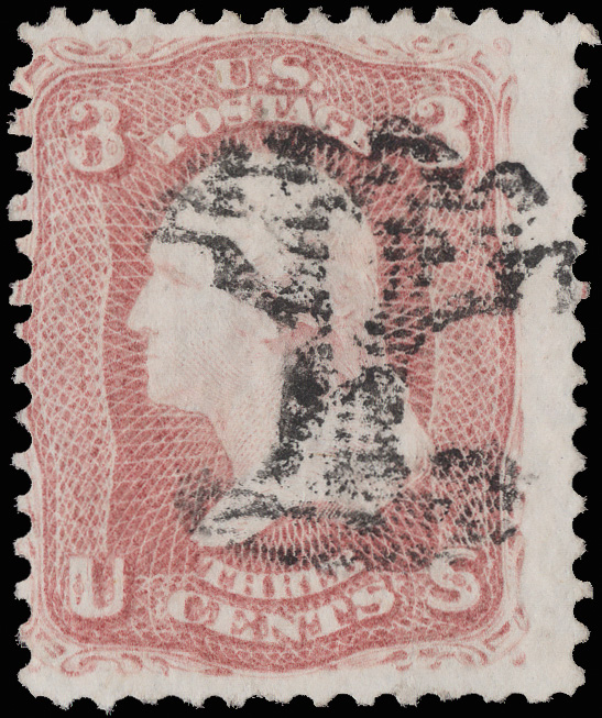 grooves cut in the surface; a choice, complete strike on a Fine 3¢ rose (65). (Image)