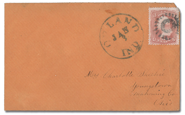 "O" in Dotted Circle of Orland, Ind. (Skinner-Eno LS-O 2), nearly complete strike in blackish blue lightly ties a 3¢ rose (65) on a cover to Youngstown, O. with a matching Jan 3 Orland c.d.s.