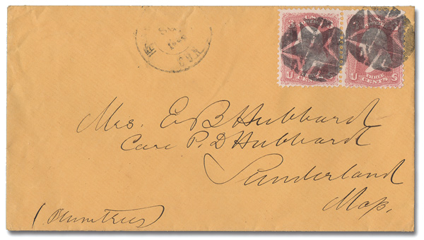 cancel tie a pair of 3¢ rose (65) on a clean cover to Sunderland, Mass. with a partial Hartford c.d.s. (Image) (Image2)