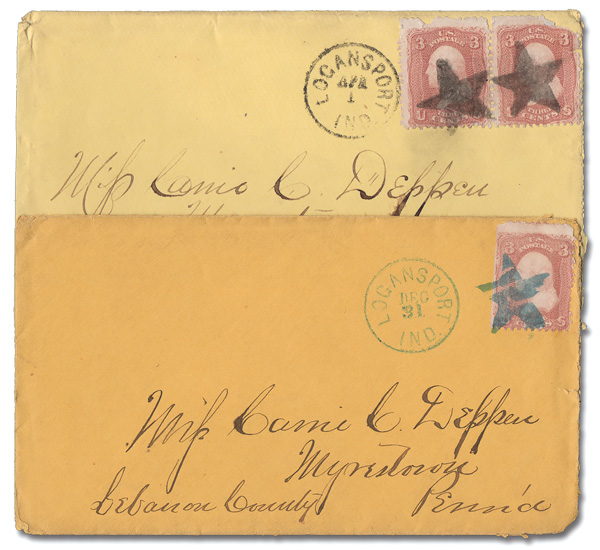 Star of Logansport, Ind. (Skinner-Eno Unlisted), two covers from the same correspondence to Myrestown, Pa., showing