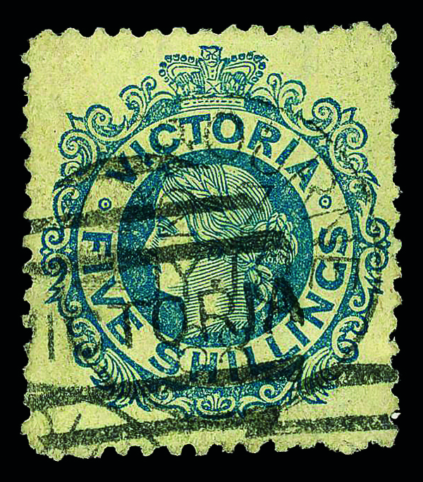 7609 og 120 image1867, Queen Victoria 5sh blue on yellow paper (Scott 120), single, Fine to Very Fine.